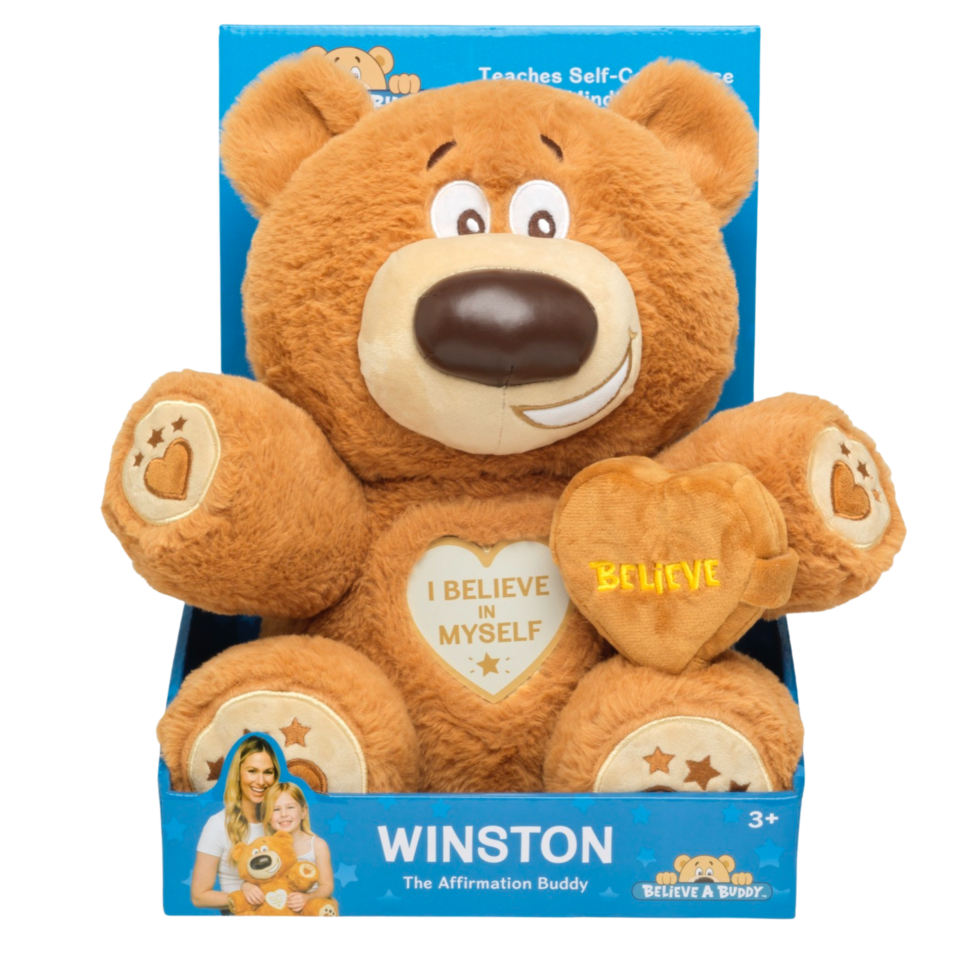 Bring home Winston, a 13-inch soft, plush affirmation bear who inspires positivity, confidence, and self-belief in every child.